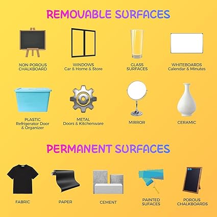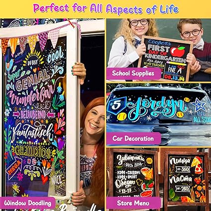 • WIDELY USED: These chalk board marker pens are suitable for writing on any primed chalkboard, whiteboard, glass or other non-porous surface, including tile, contact paper, stickers, LED boards, plastic and metal. Whether you are making weekly planners, writing menus, keeping track of chores, decorating gifts, school activities, writing labels for food storage cans, wet erase markers fine point is your best choice.