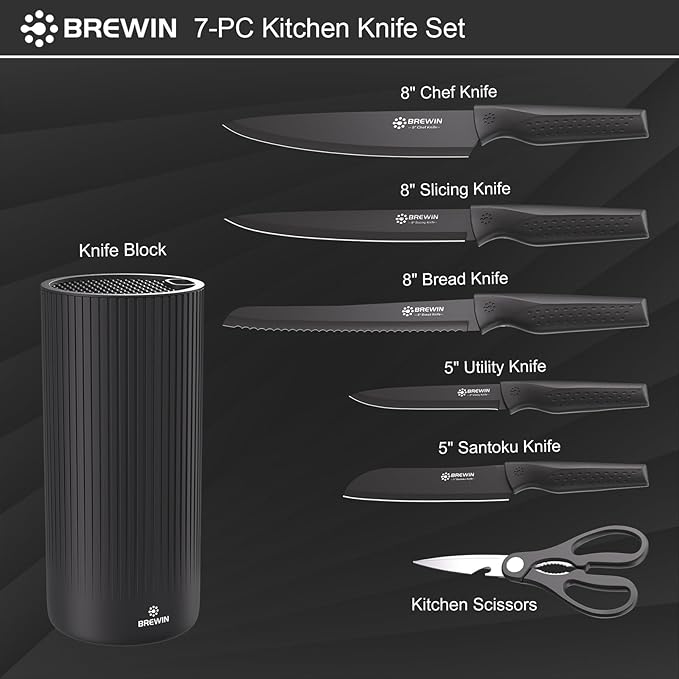 • PERFECT ALL-IN-ONE SET – Brewin kitchen knife set includes 1 x 8” chef knife, 1 x 8” slicing knife, 1 x 8” bread knife, 1 x 5” utility knife, 1 x 5” Santoku knife, 1 x kitchen scissors, 1 x universal knife block. Germain 1.4116 stainless steel. Aesthetic design. Brewin knife set meets all your kitchen works.